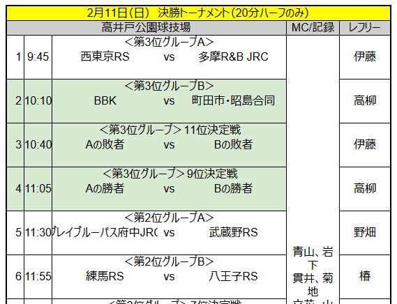 投稿日: 2024-02-082025-02-04 投稿者: Suzuki23/24 新人大会 2/11(日) 東京都新人大会トーナメント戦@高井戸グラウンド 新人大会結果表 町田市・昭島合同 西東京RS 集合:8:15までに、京王井の頭線富士見ヶ丘駅改札外→徒歩移動 8:30までにグラウンド到着→スタイル ※直接移動の場合、8:45までにスタイルしてグラウンド集合ベンチ:本部からグランドに向かって左8:45~ ブリーフィング→メンバー発表→ジャージ渡し(メンバー登録)9:05~10:05 WUP 第3位グループ:9位~12位順位決定トーナメント 井の頭線富士見ヶ丘構内 高井戸G案内図 高井戸G内部 24 新人大会 – 組合せ 固定ページ: 1 2