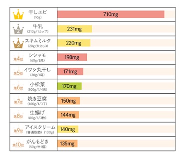 | カルシウム | : | 干しエビ、小魚類、小松菜、豆腐、牛乳など |